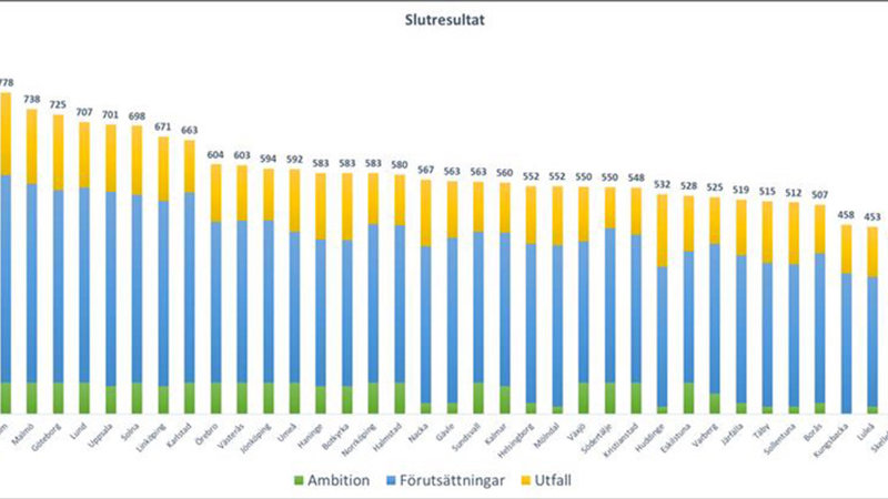 Stockholm samlar 778 poäng och är framför allt tydlig etta när det gäller förutsättningar och utfall, samtidigt som staden är en av de bästa på ambitioner. På andra plats hamnar Malmö med 738 poäng, bland annat med det näst högsta värdet i kategorin förutsättningar. Tätt därefter följer Göteborg med 725 poäng, och näst högsta värdet när det gäller utfall.