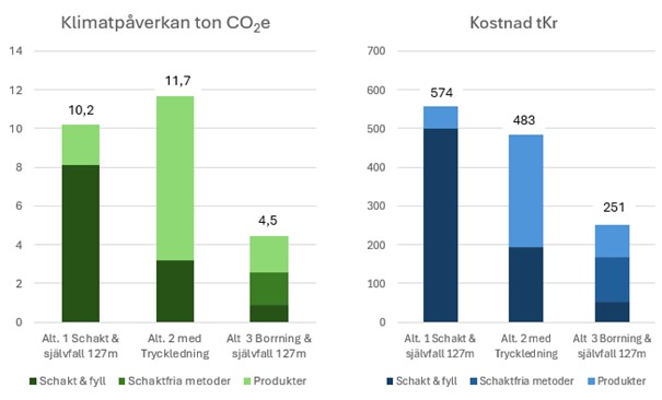 Diagrammet ovan visar resultat från Tyréns egna beräkningsverktyg Waterclimber. För VA undersöktes klimatpåverkan och kostnad för att schakta ned ledningarna 127 m med självfall (Alt 1), Schakta en kortare sträckning 60m, då krävs tryckledningar inkl. extra brunnar, pumpar och pumphus (Alt 2) eller lägga ner ledningarna med schaktfri metod borrning 127 m med självfall ( Alt.3)