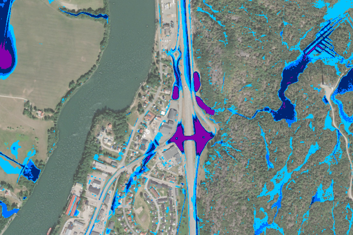 llustration: Skyfallskarteringen för Lilla Edet tätort: Karteringen visar i olika nyanser av blått och lila de simulerade översvämningar som riskerar att uppstå i samband med ett skyfall.