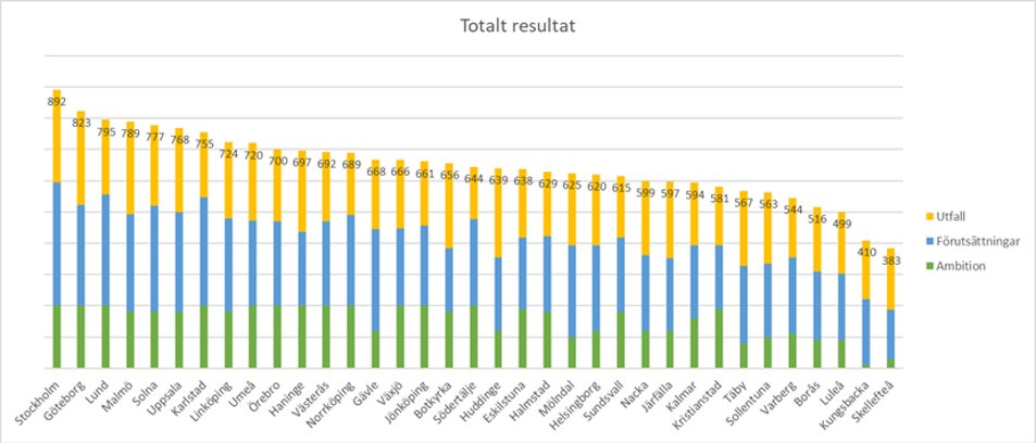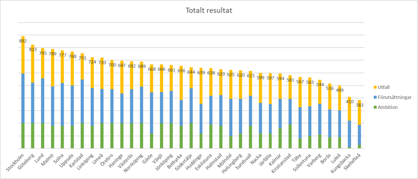 Stockholm får 892 poäng och är framför allt tydlig etta när det gäller förutsättningar. På andra plats kommer Göteborg med 823 poäng, och därefter fjolårsettan Lund som i år hamnar på 795 poäng.