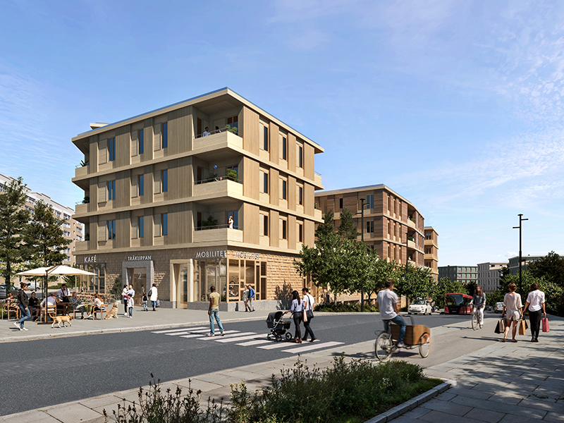 Det är byggbolaget Klövern som tillsammans med White Arkitekter valt att i ett tidigt skede anlita Tyréns för att utreda och säkerställa genomförandet av bostadshus och garage med en stomme helt i trä, vilket bidrar till ett lågt CO2-avtryck.