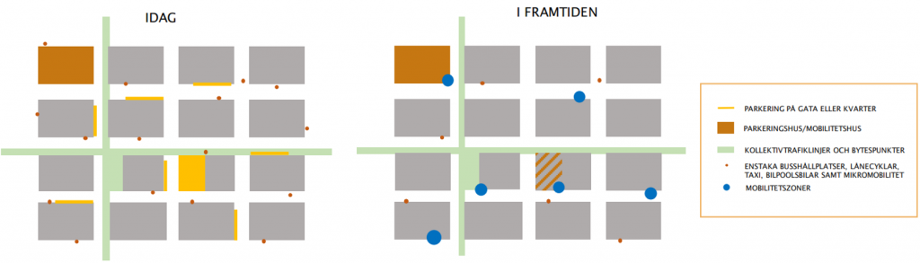 På uppdrag av Malmö stad utredde jag tillsammans med min kollega Sophia Hammarberg vad det skulle kunna innebära att omvandla parkeringshus till mobilitetshus. Utredningen Från parkeringshus till mobilitetshus går ungefär att sammanfatta som att bytespunkter, mobilitetshus och mobilitetszoner tillsammans skapar ett ekosystem för mobilitet. Med mobilitetszon menas i detta sammanhang en någorlunda samlad plats för lånecyklar, elsparkcyklar, buss, taxi och någon poolbil. Allt måste inte finnas i alla zoner men förslagsvis åtminstone tre av dem.