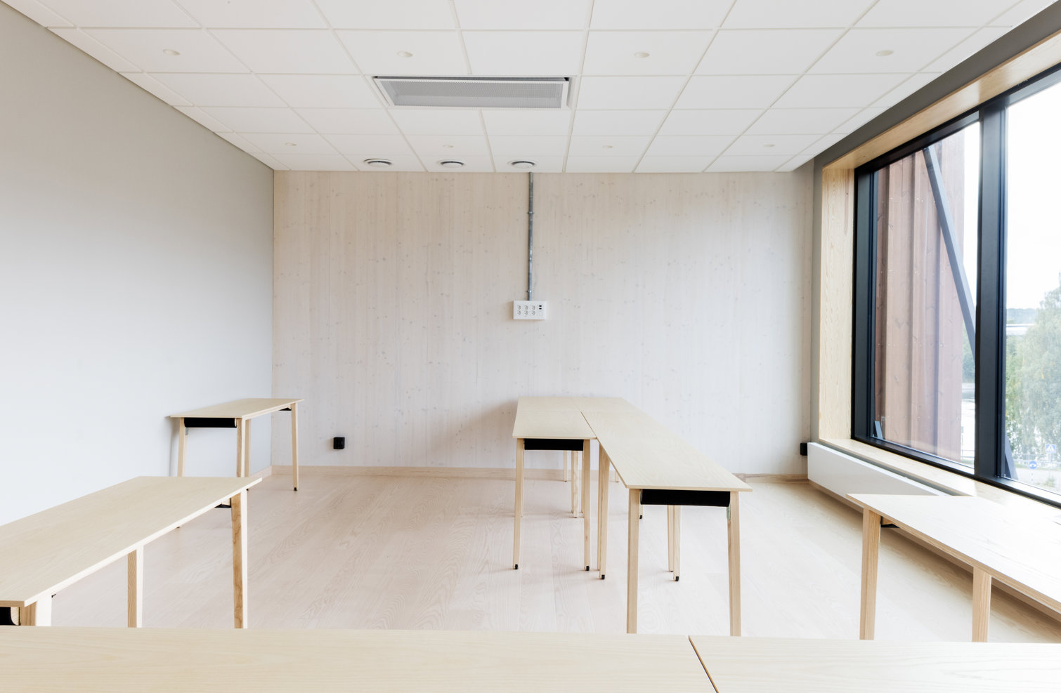 Att byggnaden skulle utföras i trä var en tidig förutsättning vilket resulterat i en pelarstomme i limträ samt bjälklag och stomstabiliserande delar i KL-trä. Exteriören präglas av en träfasad i värmebehandlad gran som infärgats brun med inslag av mörkare partier. Den bruna fasadfärgen återfinns för övrigt i några av de äldre nationalromantiska trävillorna i det omgivande närområdet.