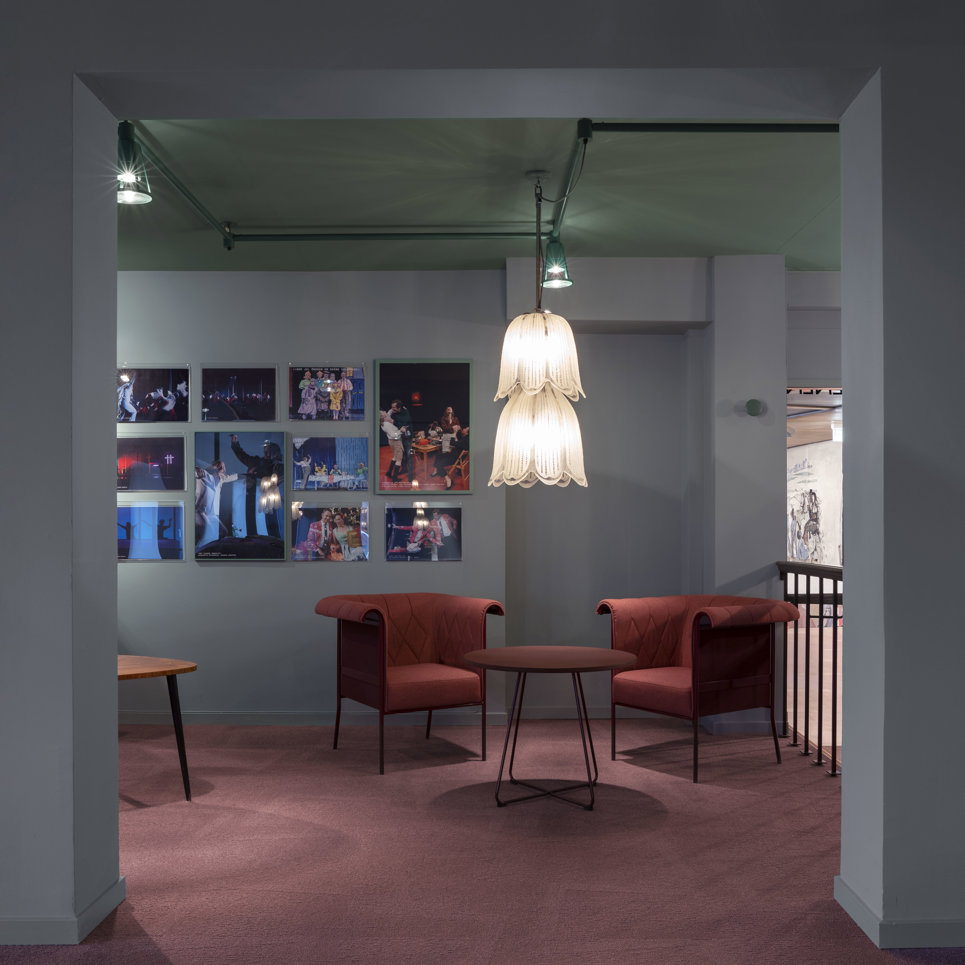 Ett genomgående tema är återvunna armaturer och tillbehör från teaterns outsinliga scenförråd. Till exempel så har originalglaskupor från salongen byggts om till pendelarmaturer ovan bord och teaterstrålkastare av äldre modell har blivit golvarmaturer i Lilla foajén.