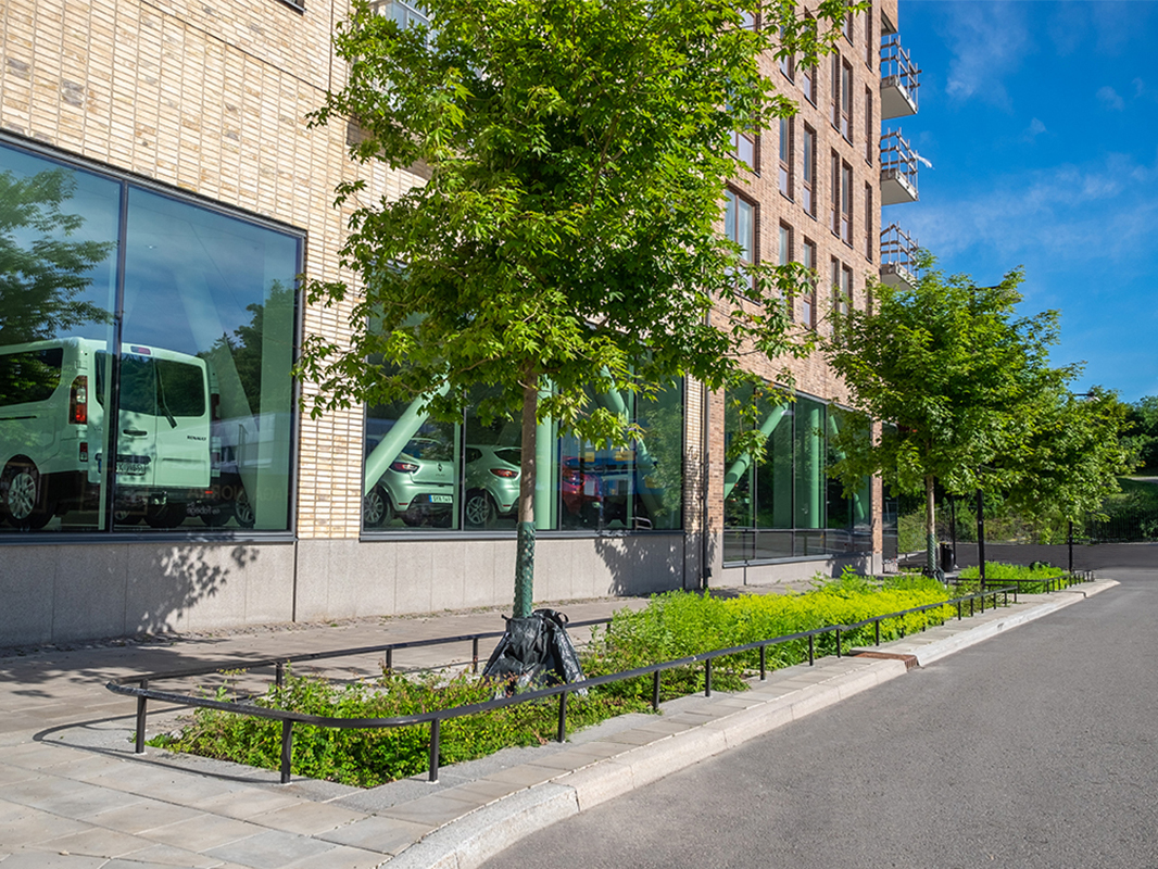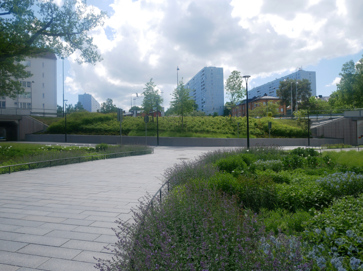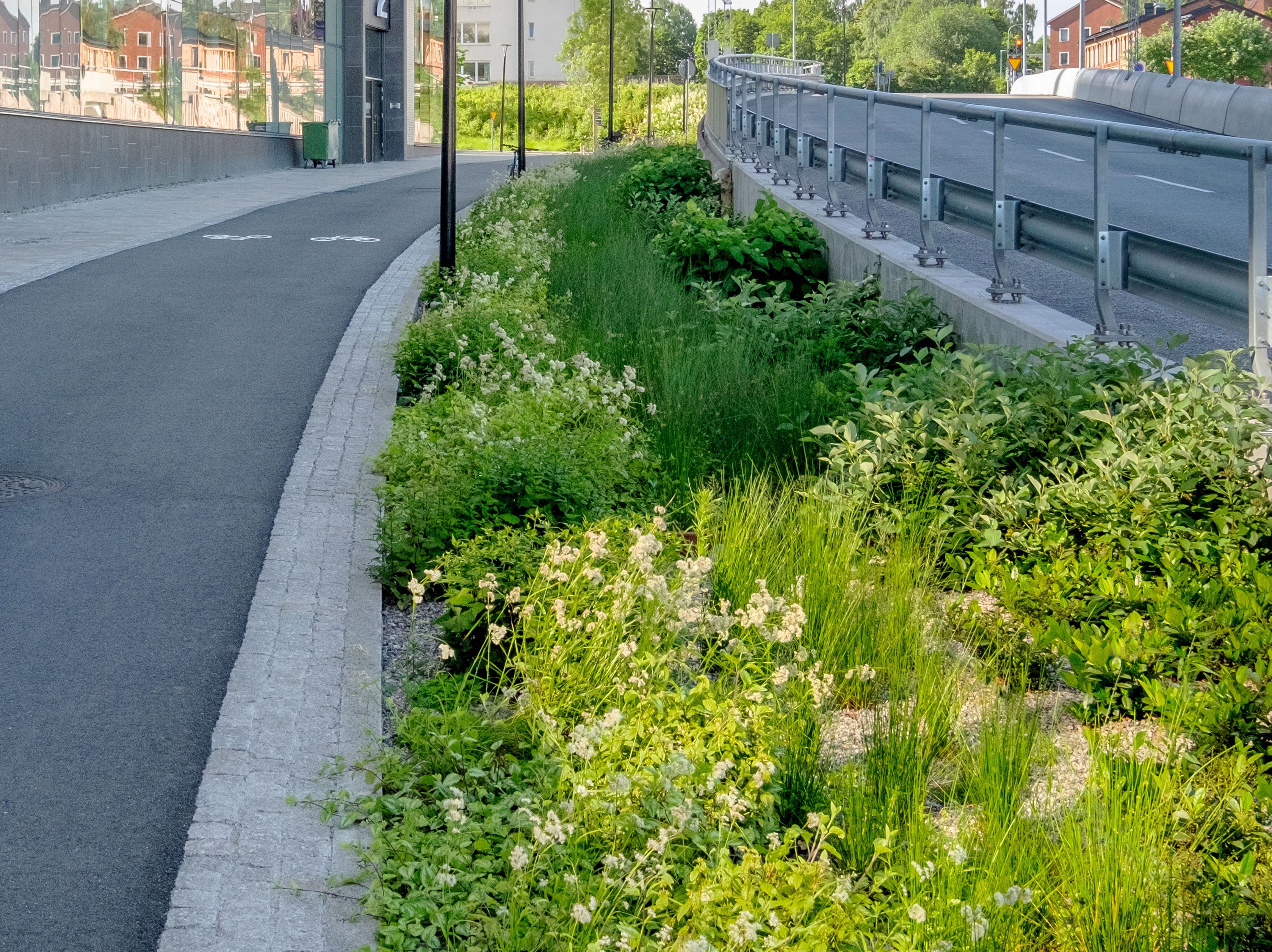 Stora delar av områdets gator är ovanpå ett underjordiskt garage och stora skillnader i befintliga omgivande höjder innebar en del utmaningar. Det bidrog bland annat till att en rad platsspecifika lösningar för dagvattenhantering togs fram, i form av olika slags regnväxtbäddar och grönytor med kapacitet för dagvattenfördröjning.