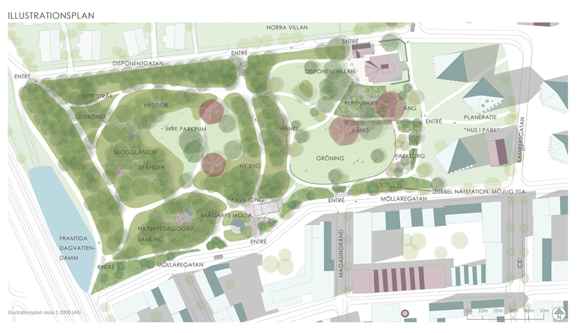 Tyréns uppdrag har varit att formulera en vision för hur de stora befintliga värdena kan förädlas och bli en självklar del av det sammanhang som växer fram i anslutning till parken.