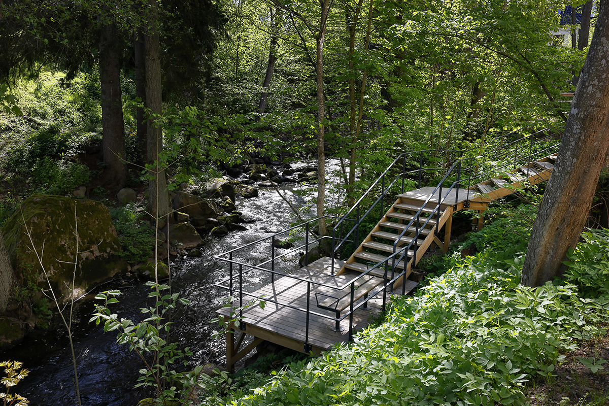 En liten bit norr ut ligger finns en balkong / utsiktsplats placerad längs med gångvägen. Härifrån finns det även en öppen trätrappa som leder ner till en liten berghäll. Här kan man komma ner till bäcken, doppa tårna eller sitta på trappan och titta på det forsande vattnet.