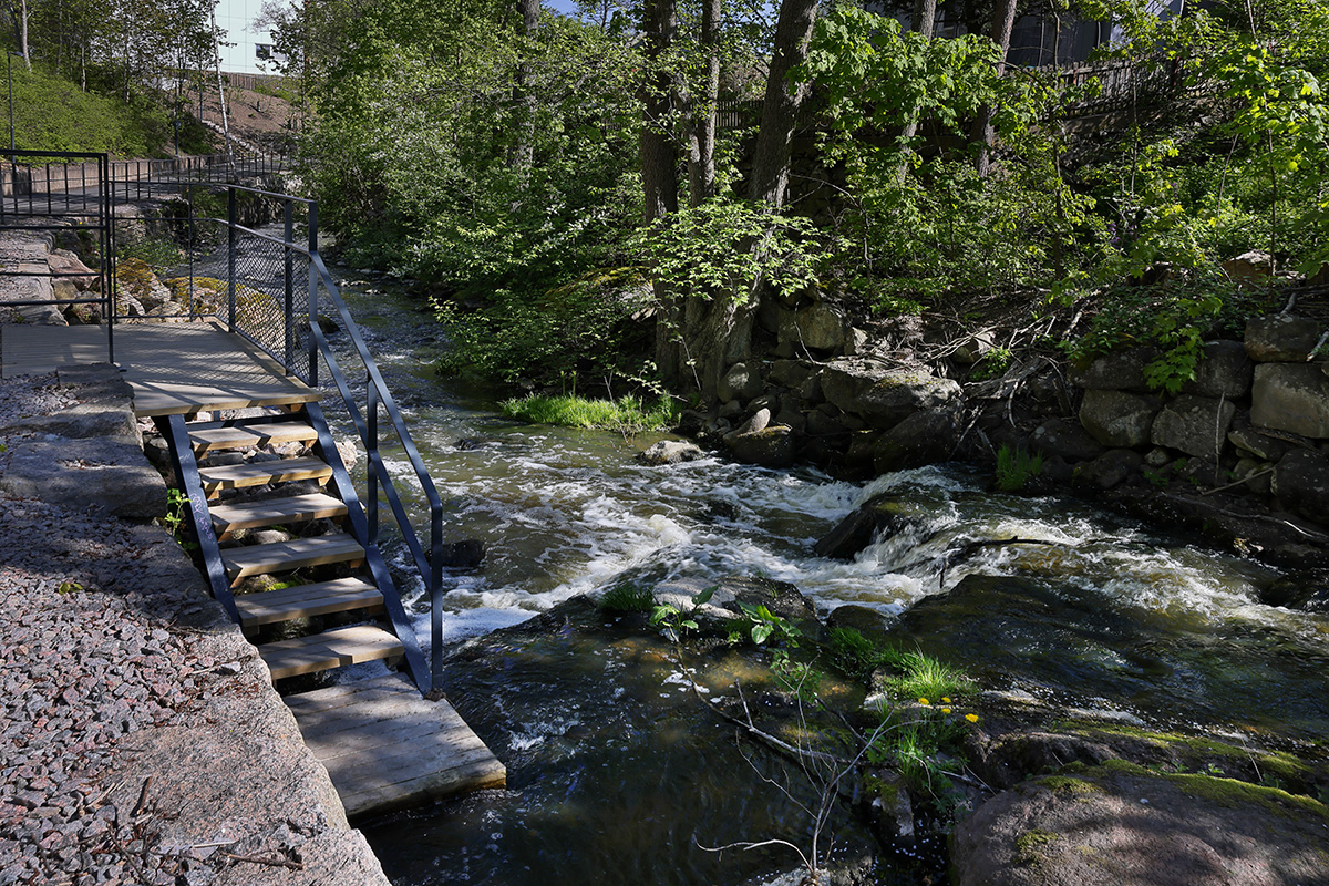 I den södra delen av området där slänterna är flacka har en området ”Stigen” längs med vattnet skapats. Två platsbildningar har skaptas längs med bäcken, en sittplats på stockbänkar och en mer lekfull skulptural sittmöbel likt ett ”plockepinn”. I den södra delen har även två nya stentrappor byggts för att möjliggöra den tvärgående rörelsen upp mot villaområdena på östra sidan om gång och cykelvägen.