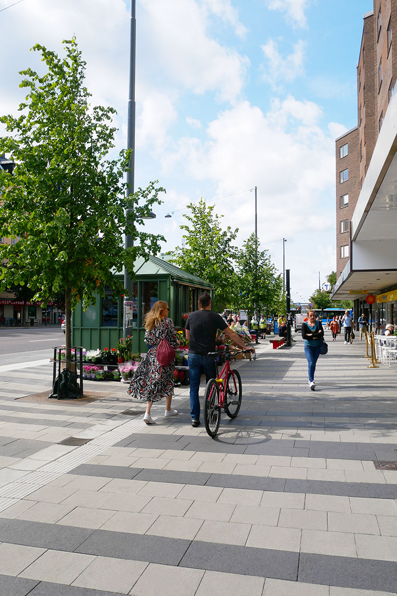 En bred mittrefug togs bort och komprimerar vägens totala bredd och möjliggör torgets utbredning. Markmaterialet bildar en visuell zonering som tydliggör gångyta, möbleringsyta och plats för uteservering.